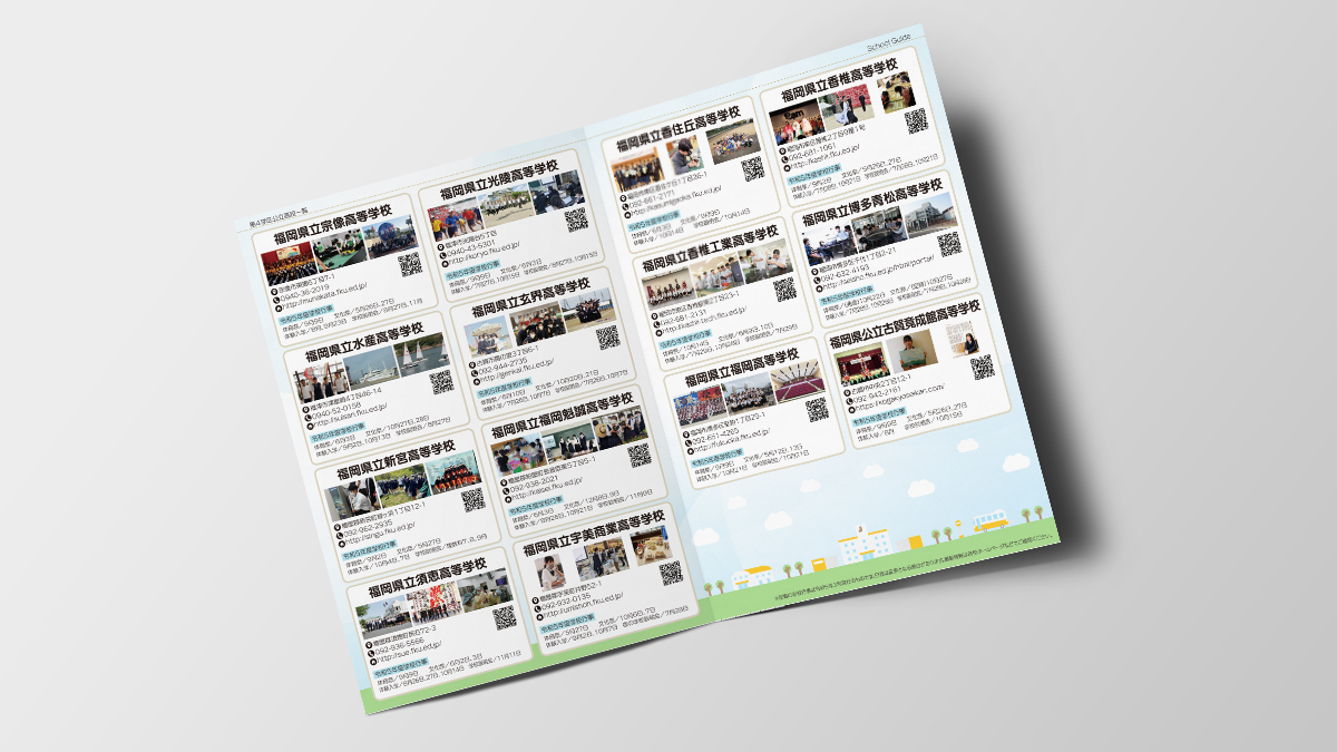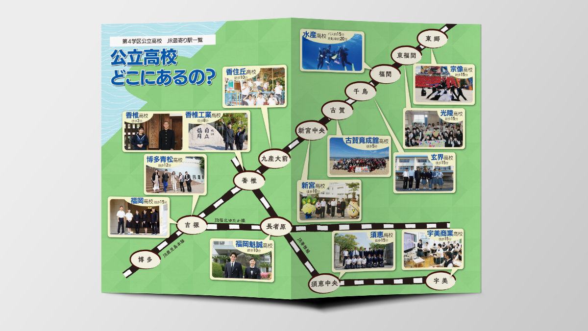 第4学区公立高校リーフレット制作 2023年 2023.04.03 PEOJECT 第4学区公立高校リーフレット制作 DATE 2023.04.03 PLACE CLIENT 第四学区中高連携事業(事務局校:福岡県立香住丘高等学校) ORDER パンフレット制作 NOTE JR鹿児島本線沿線の公立高校をマップで示した第4学区公立高校のリーフレットです。第4学区の中学生向けに配布されています。 SPEC A4サイズ(A3二つ折り) 両面4色 コート110kg LINK パンフレット制作 制作実績