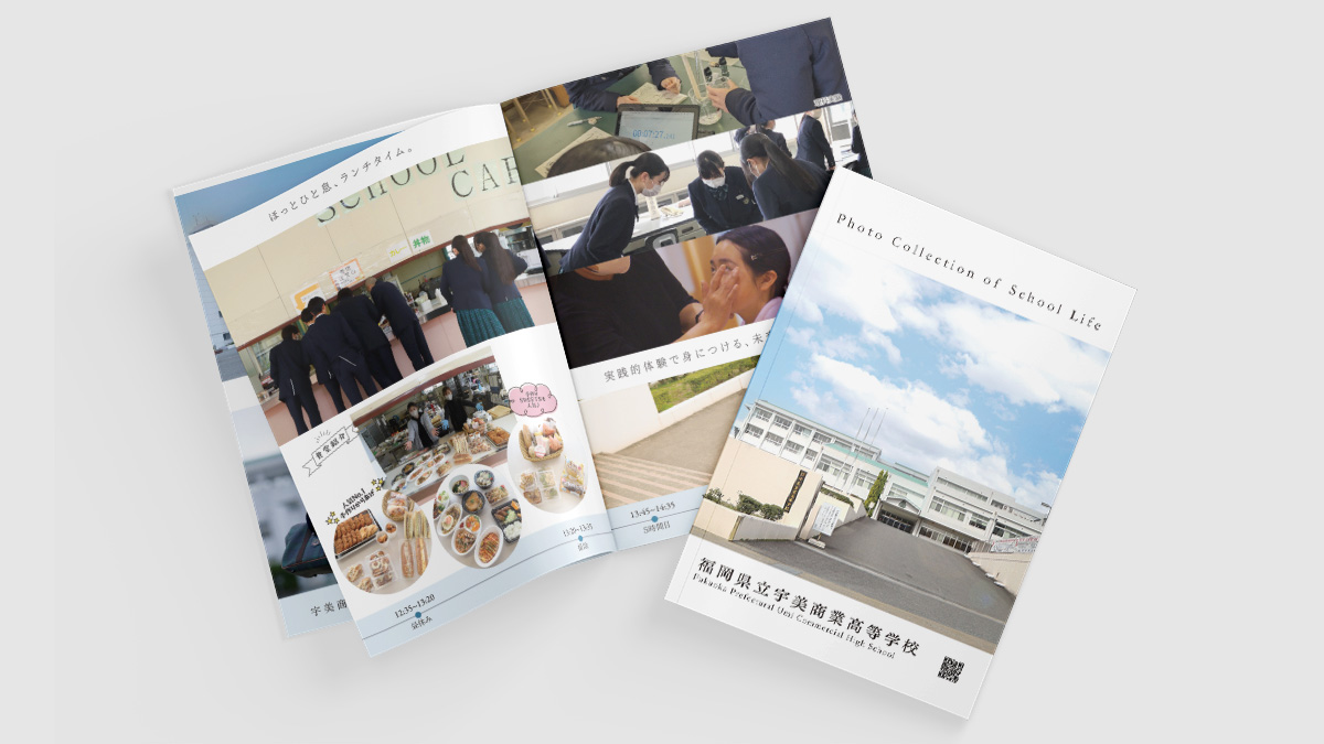 - 福岡県立宇美商業高等学校の「令和7年度入学生用学校案内」パンフレットを制作しました。同時に学校生活をイメージするフォトブックを制作しました。パンフレット・フォトブックに使用するイメージ写真を撮影しました。
